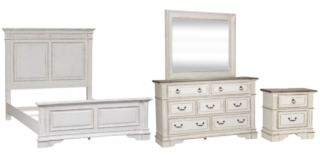 Design possibilities are endless with the Abbey Park queen panel bed, dresser, mirror, and nightstand. Crafted of poplar solids and cathedral white oak veneers, this kit features an antique white finish with heavy chipping and weathered brown whitewash tops, full extension drawers.Read More