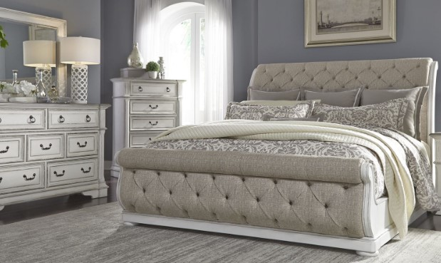 This sleigh bed features a rolled headboard and a bent rolled footboard, both upholstered in a beautiful, tufted chenille. The dresser has seven drawers and can equip the mirror that features a beveled edge with the included bolt-on supports. The chest offers an additional five drawers of storage. The blending of European traditional design influences makes Abbey Park a truly unique style for any living space.