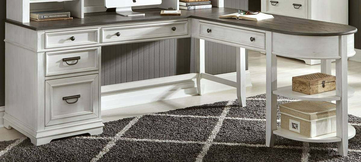 Work from home in comfort and style with the Allyson Park optional L-shaped desk. Crafted of pine solids with cathedral white oak tops and pine veneers, this piece features a wire-brushed white finish with charcoal tops.Read More