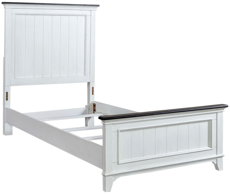Create a classic look with a casual feel using the Allyson Park panel bed. Crafted of pine solids, pine veneers, and cathedral white oak tops, this piece features a center slat support system, bolt on rails, planked panels, bead molding, charcoal grey cap rails, and is anchored by tapered block feet.Read More