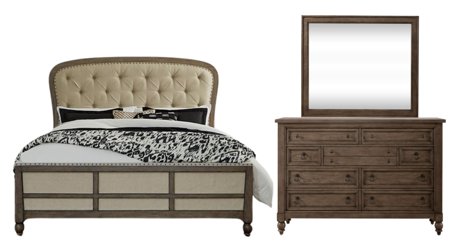 When details matter, choose the Americana Farmhouse queen shelter bed, dresser, and mirror. Crafted of poplar solids with white oak veneers, this kit features a wire-brushed dusty taupe finish with wormhole distressing, full extension drawers with wood framed drawer fronts, premium felt-lined top, and cedar lined bottom drawers, and turned bun feet.Read More
