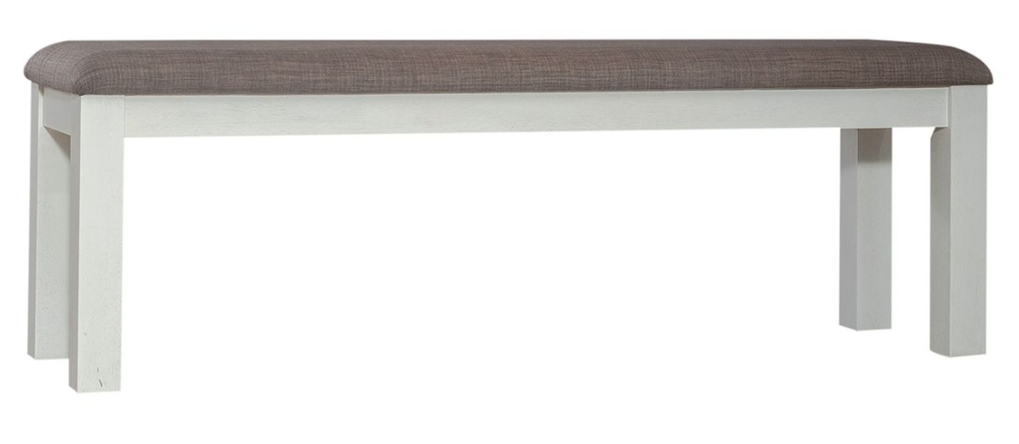 Feel at home with the Brook Bay upholstered dining bench. Crafted with excellence using rubberwood solids, this bench features a textured white finish. The seat is upholstered in 100% polyester Grey Linen fabric. The block legs feature nylon chair glides to protect your flooring.Read More