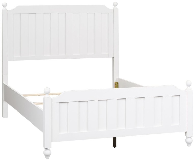 Fall into the Cottage View panel bed at night. Crafted by melamine and a rubberwood solid frame, this piece features a clean white finish, a square post bed with round finials and slat overlays, anchored by bun feet. Never question the reliability of this bed with the hook on rails and center supported slat system.Read More