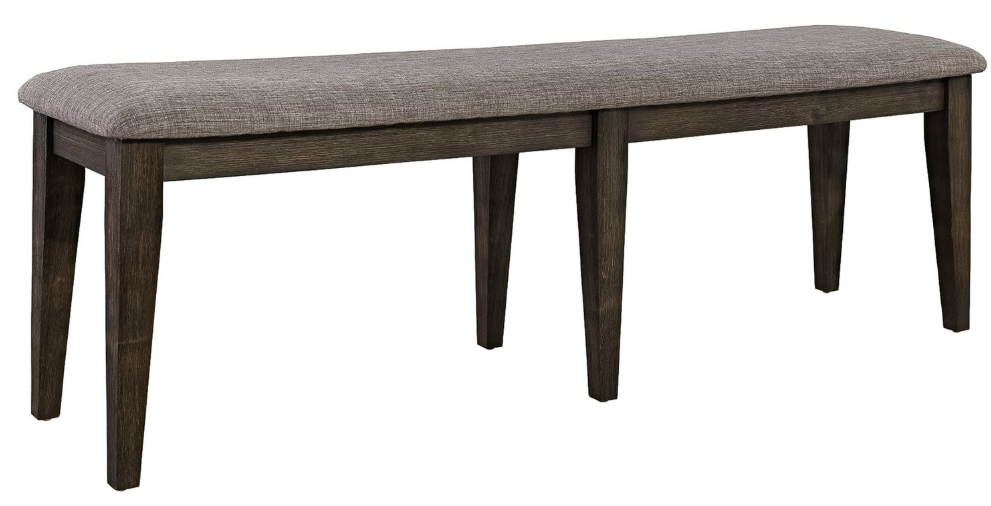 Sit in comfort and indulge in rustic style with the Double Bridge bench. Crafted of rubberwood solids, this piece features a dark chestnut finish, grey linen upholstery, nylon chair glides to protect your flooring, and beautifully tapered legs.Read More