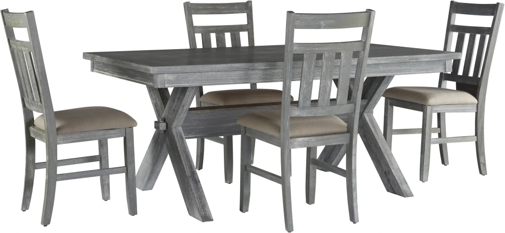 The five-piece dining table set creates an inviting space where friends and family will gather for everyday and celebratory meals. It offers down home appeal with a classic x-style trestle base table and charming upholstered chairs with eye-catching, classic slatted backs.Read More